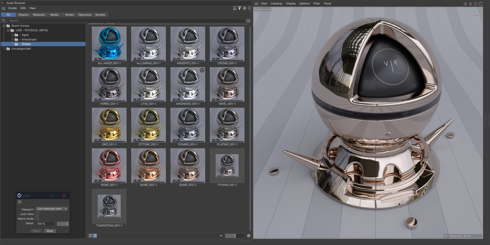 Un intero set di | Corona Materiali Cinema 4D, in formato libreria Cinema 4D, che consente un facile accesso e utilizzo delle librerie di materiali.