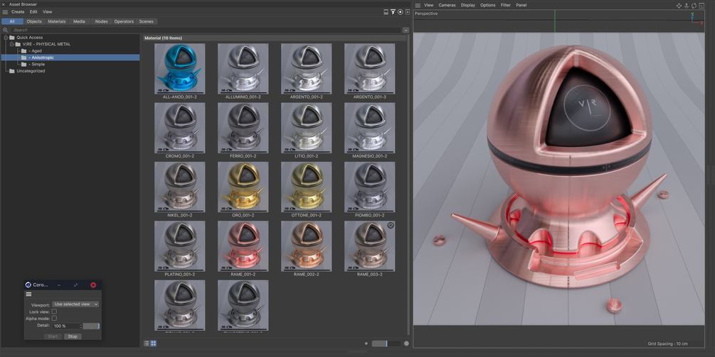 Un intero set di | Corona Materiali Cinema 4D, in formato libreria Cinema 4D, che consente un facile accesso e utilizzo delle librerie di materiali.